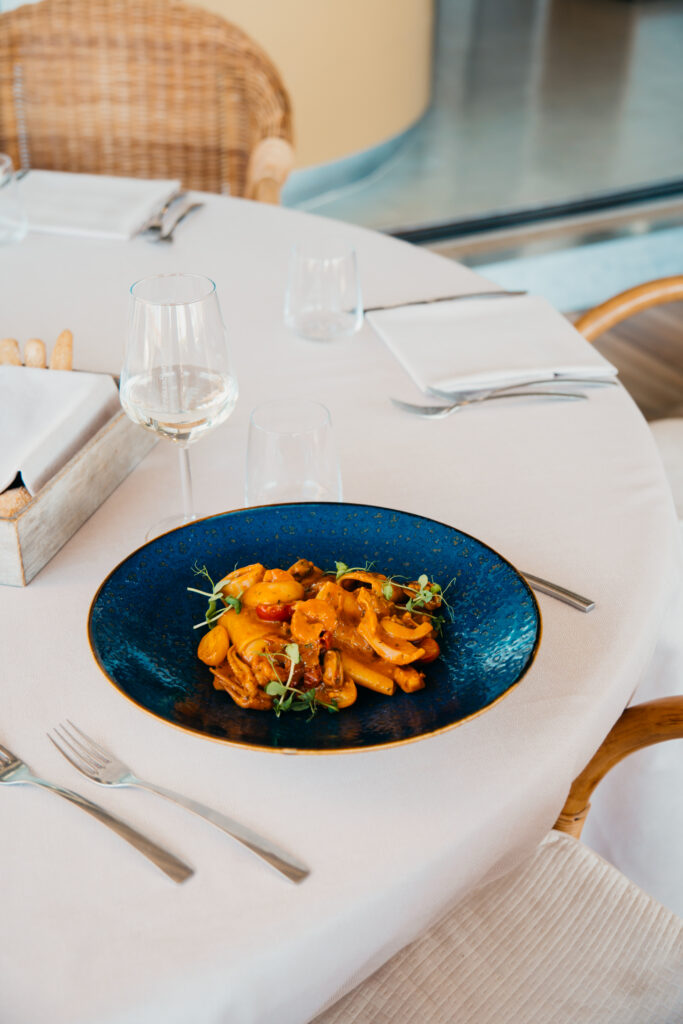 Calamarata pasta with Seafood Amatriciana Sauce, Sicilian bluefin Tuna, Amatrice DOP Guanciale, chopped Pistachios
